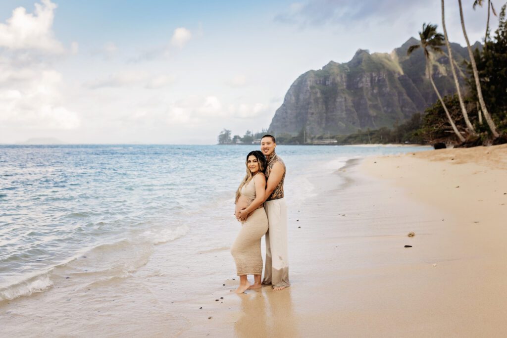 There are Hawaiian evenings that feel almost unreal, and Cathy & Teddy’s sunset maternity session at Ka’a’awa Beach was one of them. With soft golden light, gentle waves, and those iconic Koʻolau mountains standing in the distance, everything aligned to celebrate this moment in their lives with warmth, intimacy, and joy.