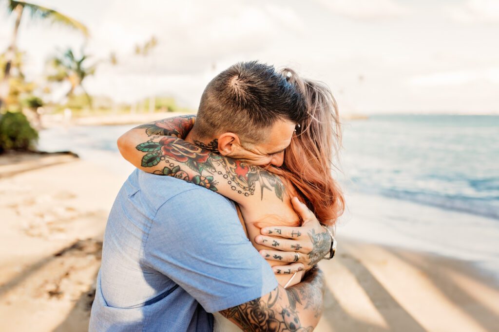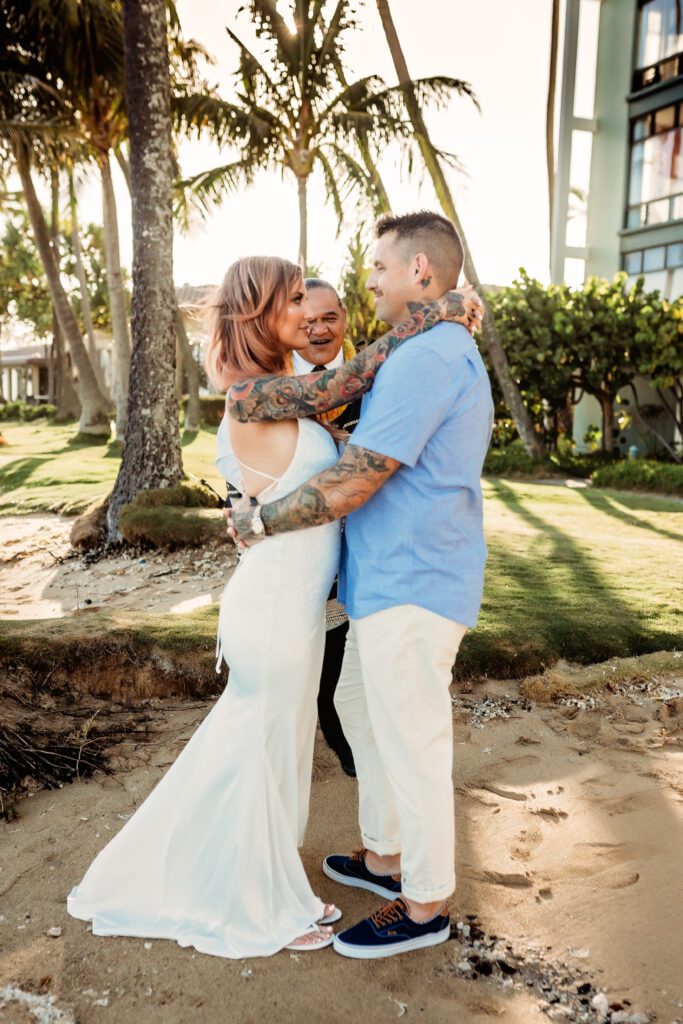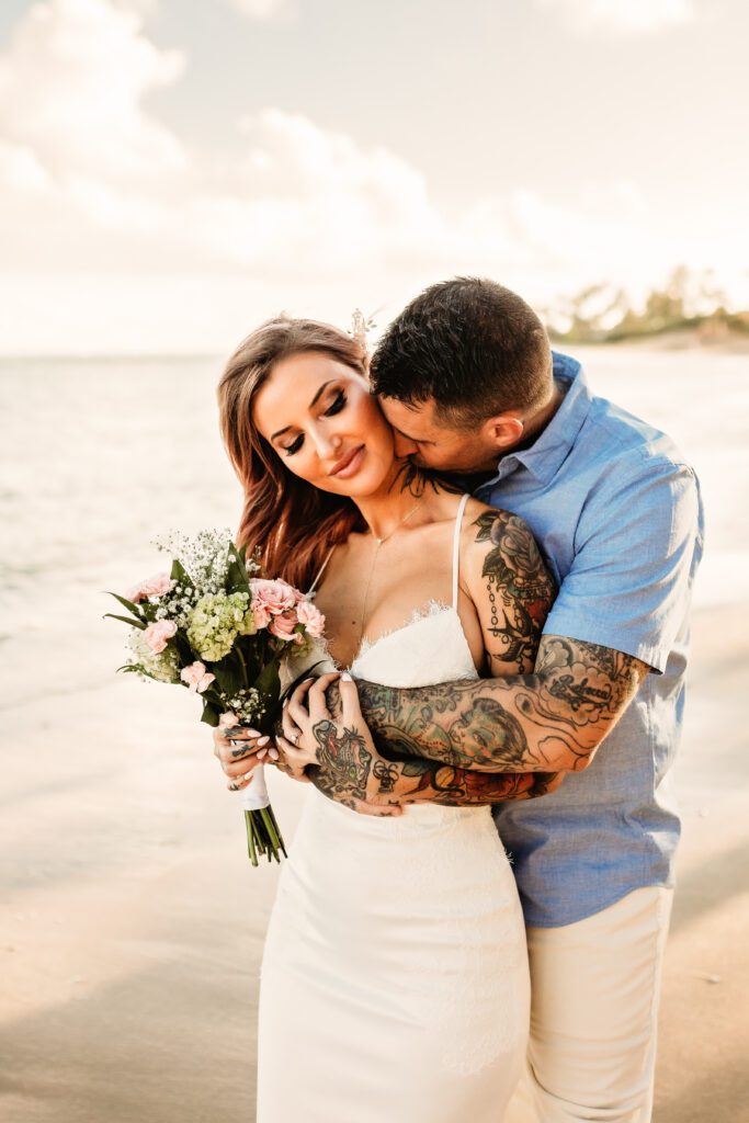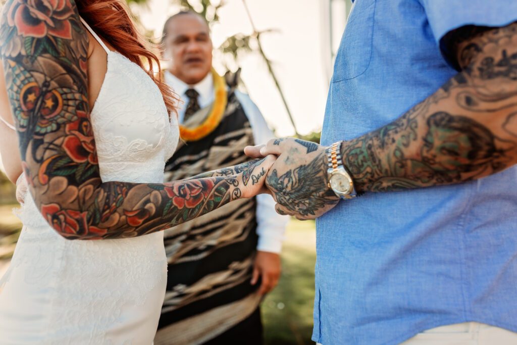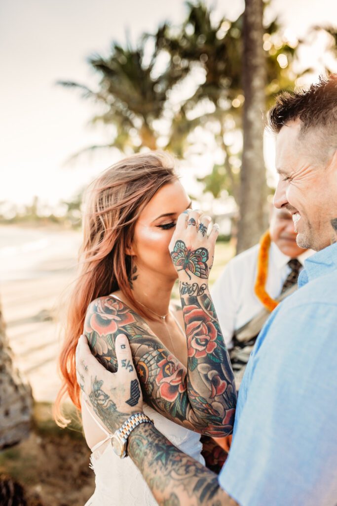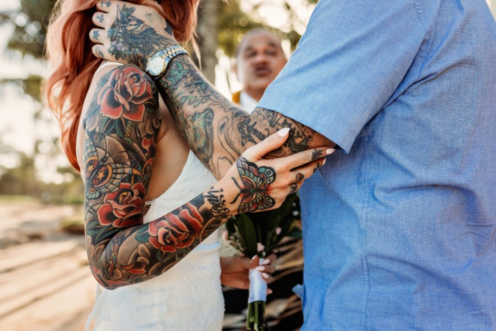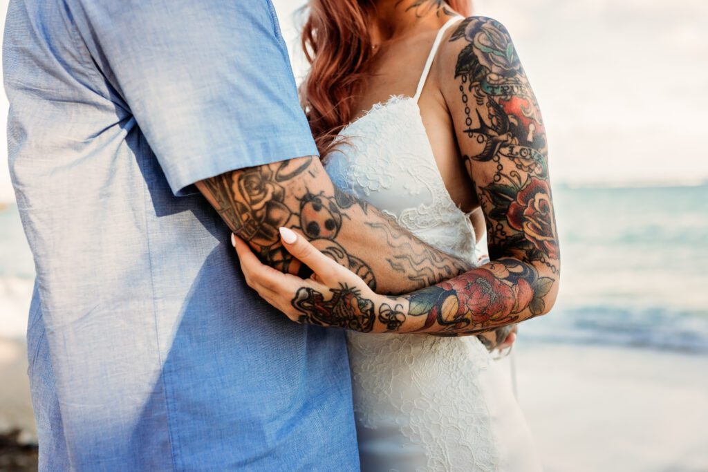 One of my favorite details was the contrast between their personal style and the soft beach setting — her elegant white gown paired with intricate tattoos created a modern, romantic feel that perfectly matched the intimate nature of their Kahala Beach wedding.
