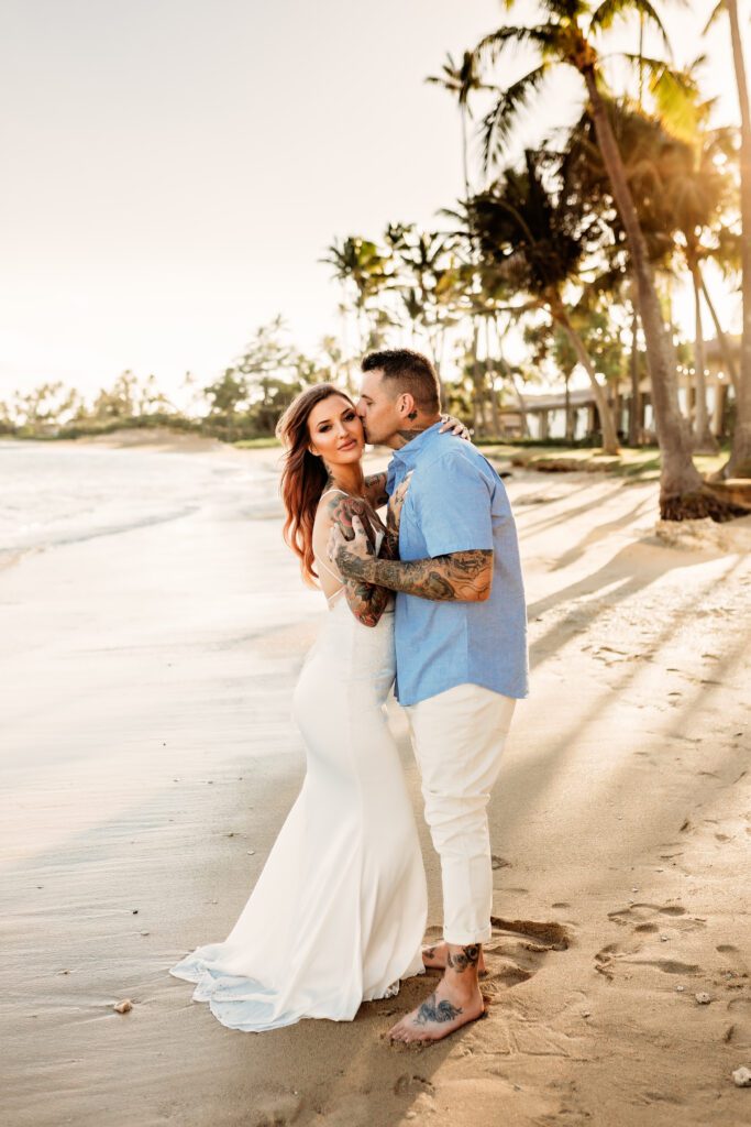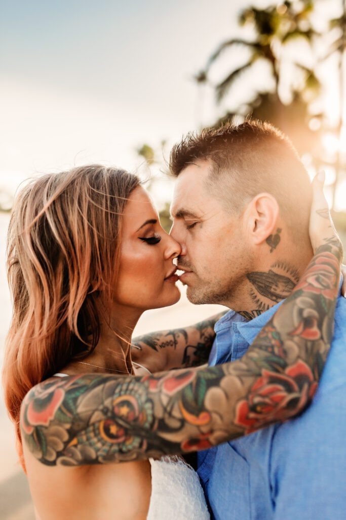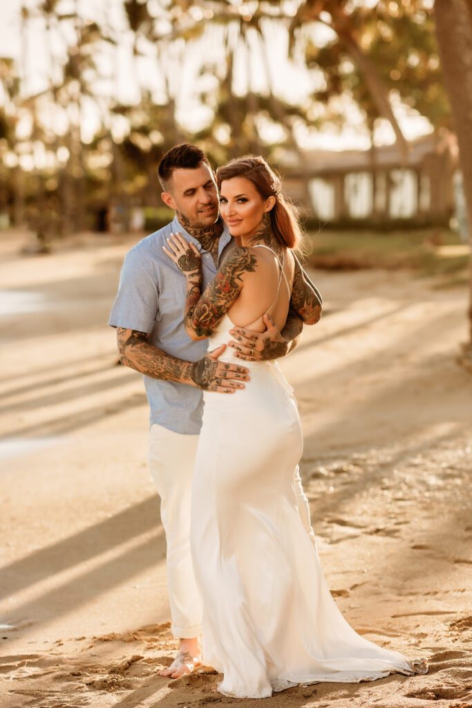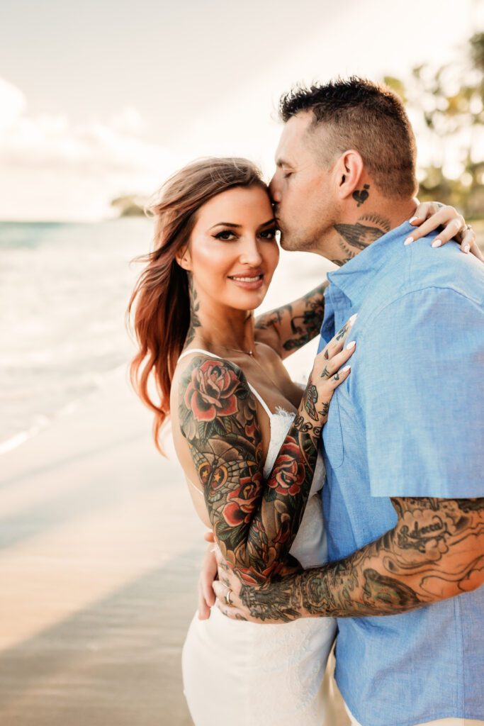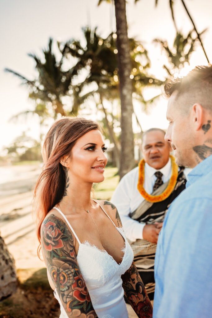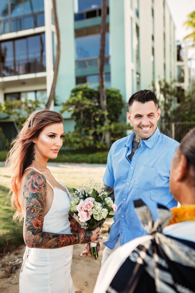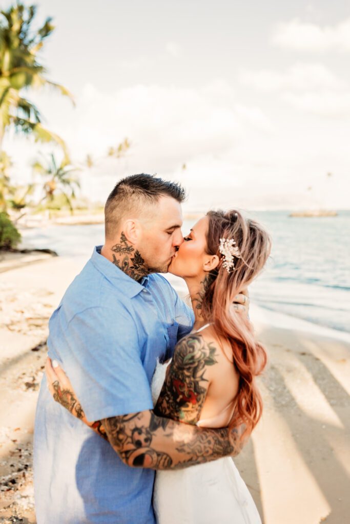 One of my favorite details was the contrast between their personal style and the soft beach setting — her elegant white gown paired with intricate tattoos created a modern, romantic feel that perfectly matched the intimate nature of their Kahala Beach wedding.