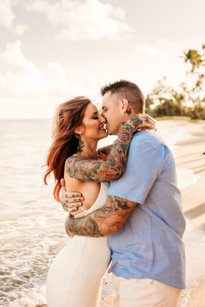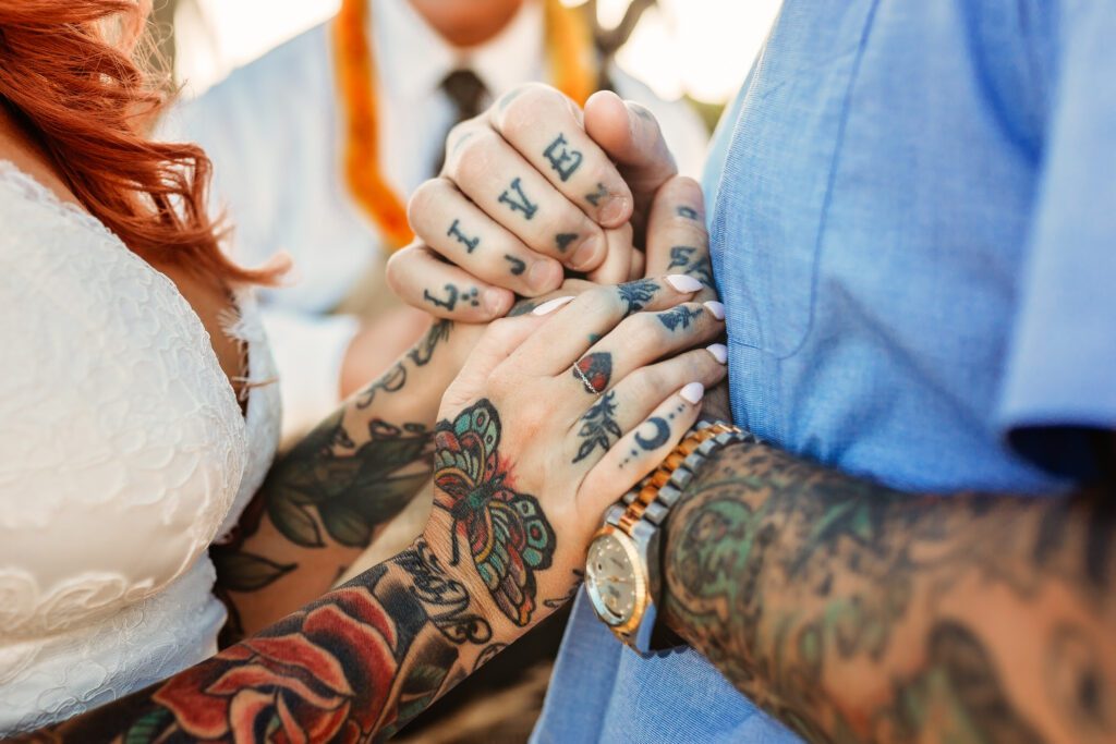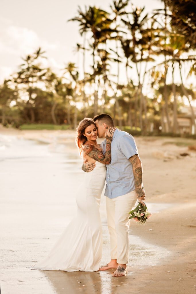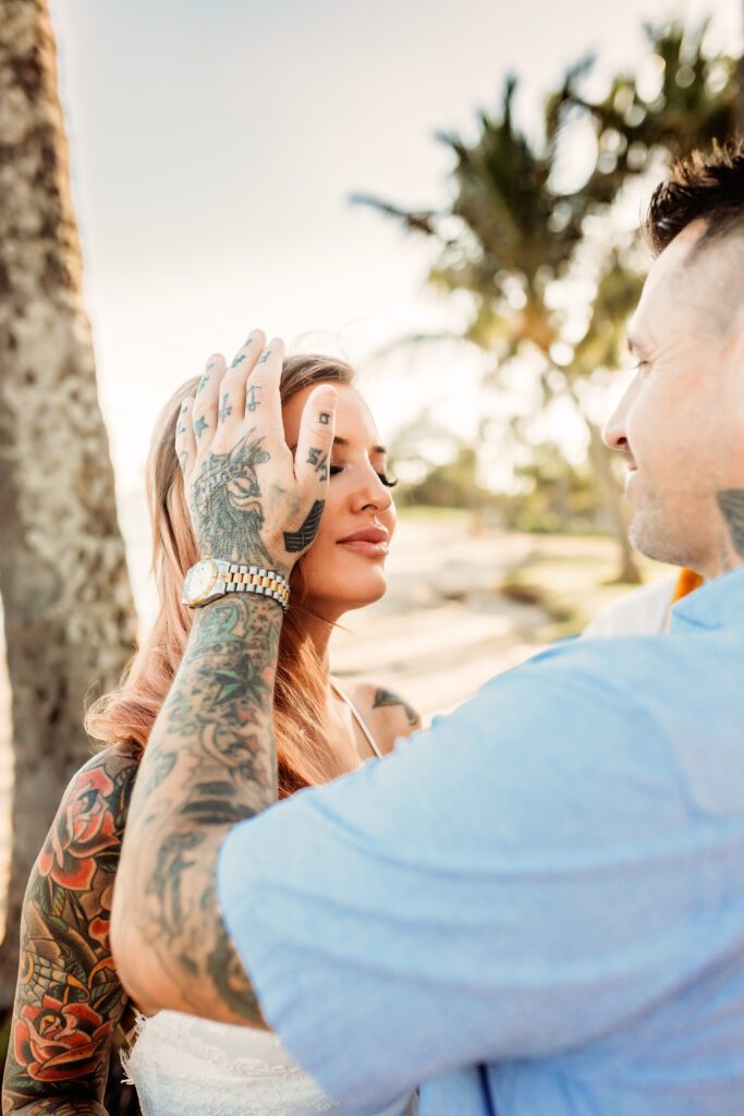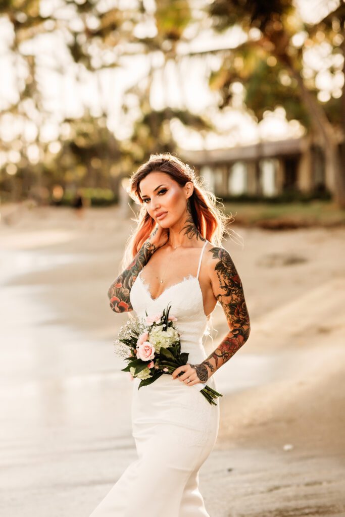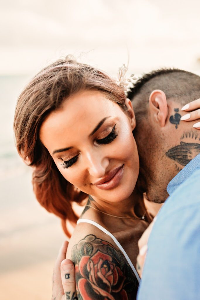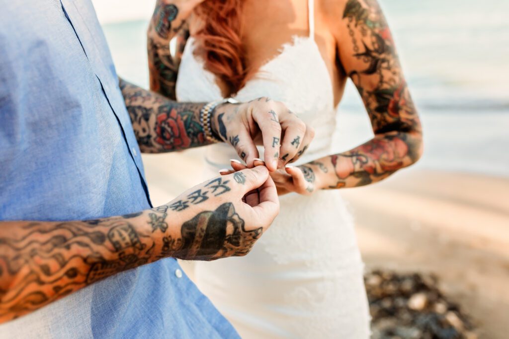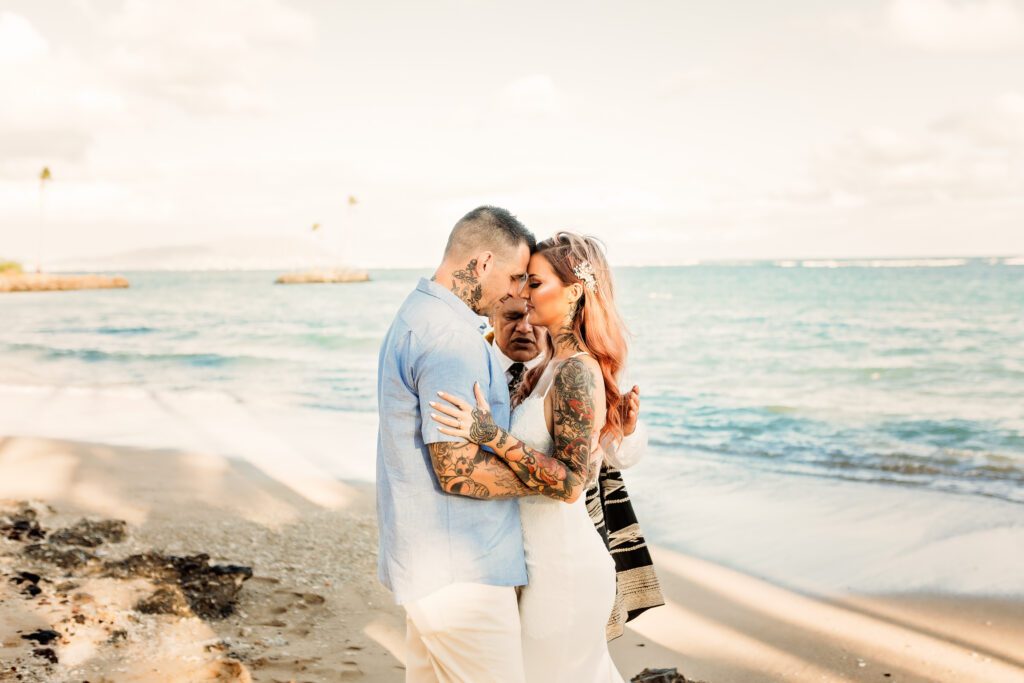 One of my favorite details was the contrast between their personal style and the soft beach setting — her elegant white gown paired with intricate tattoos created a modern, romantic feel that perfectly matched the intimate nature of their Kahala Beach wedding.