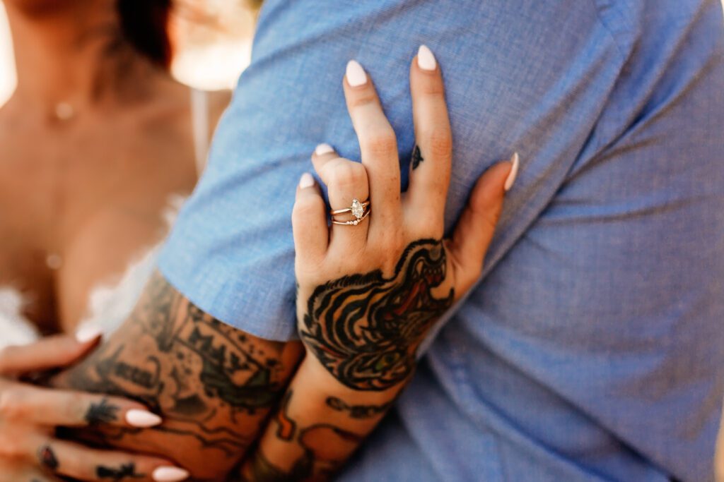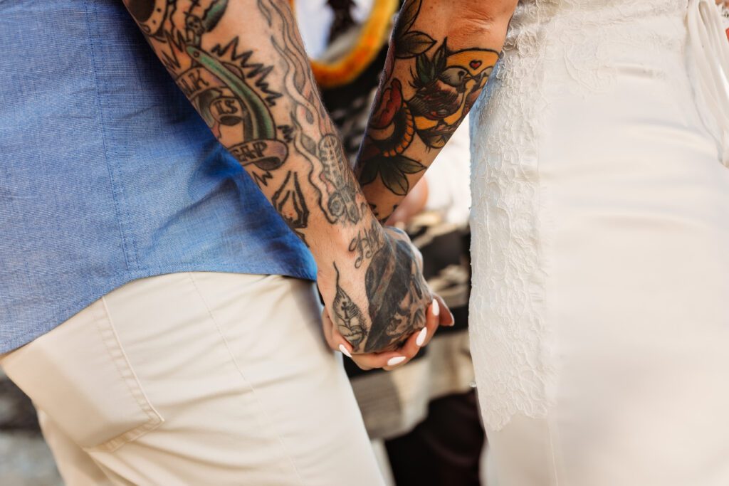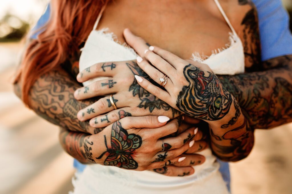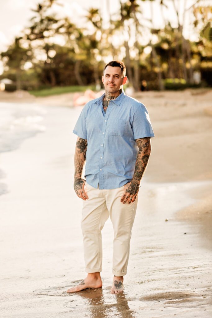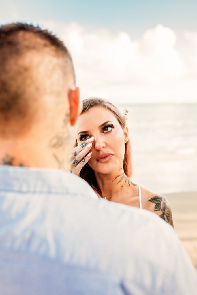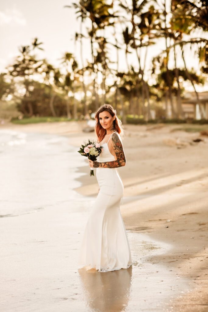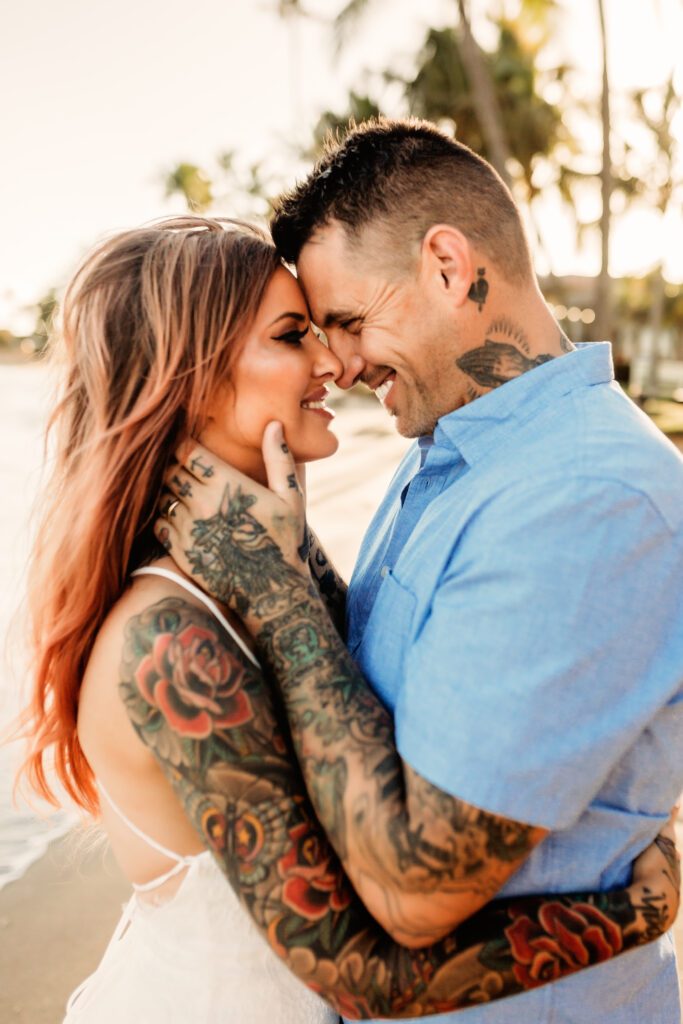One of my favorite details was the contrast between their personal style and the soft beach setting — her elegant white gown paired with intricate tattoos created a modern, romantic feel that perfectly matched the intimate nature of their Kahala Beach wedding.