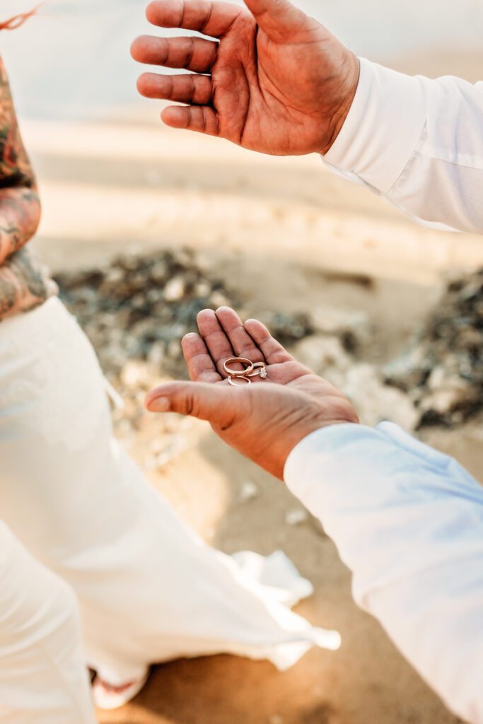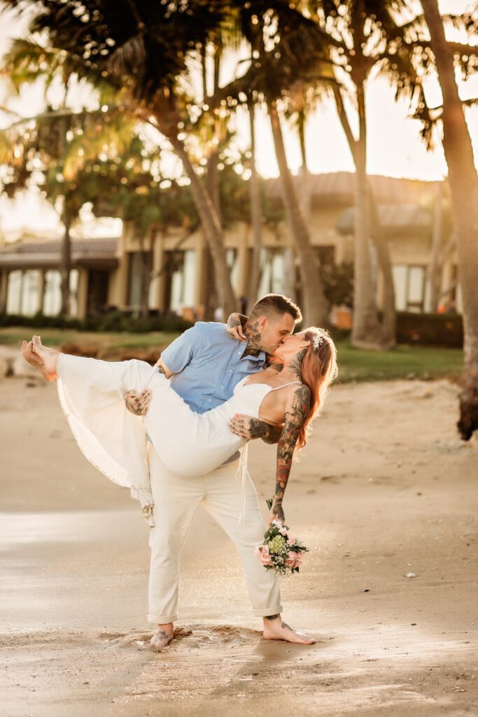 Quiet shoreline. Golden sunset light. Palm trees swaying in the background. No crowd. No pressure. Just two people deeply in love.