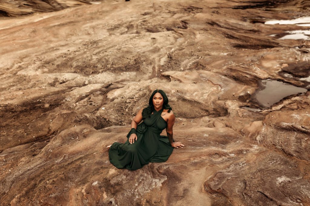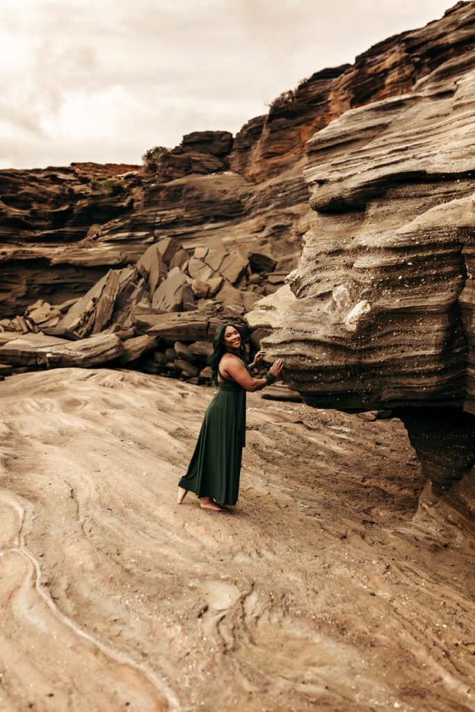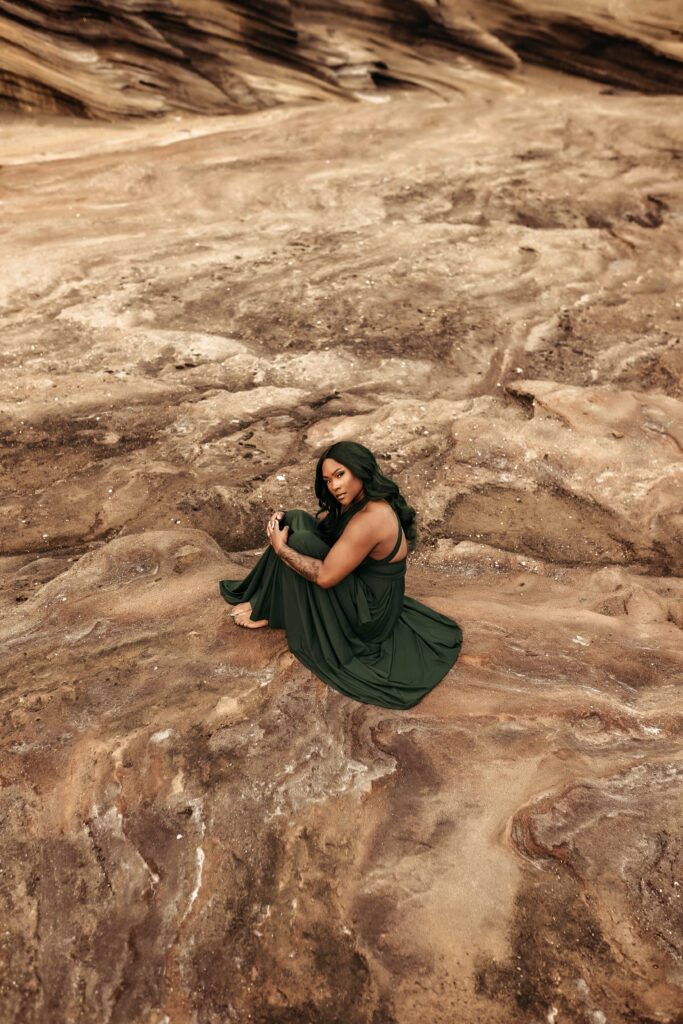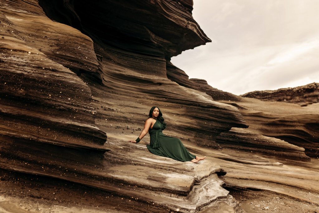 This session was styled in deep, earthy tones that complemented the natural rock formations of Lanai Lookout. The contrast between softness and structure created portraits that feel refined, expressive, and timeless.