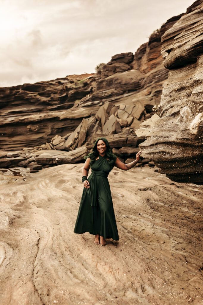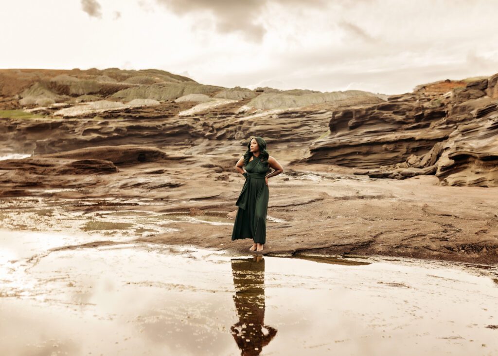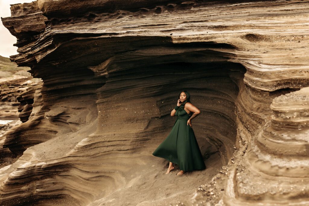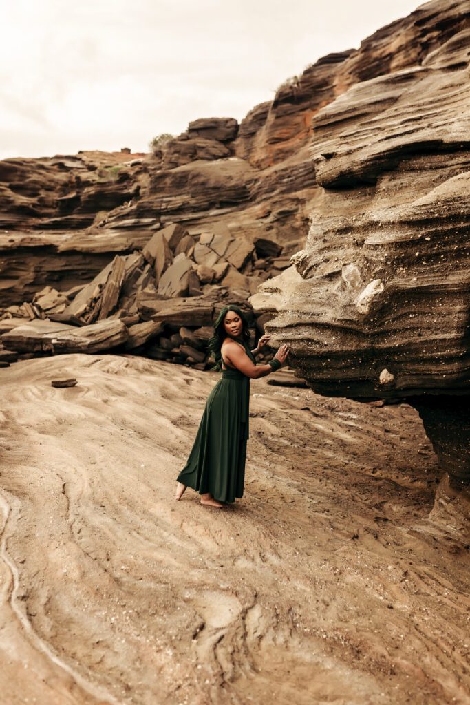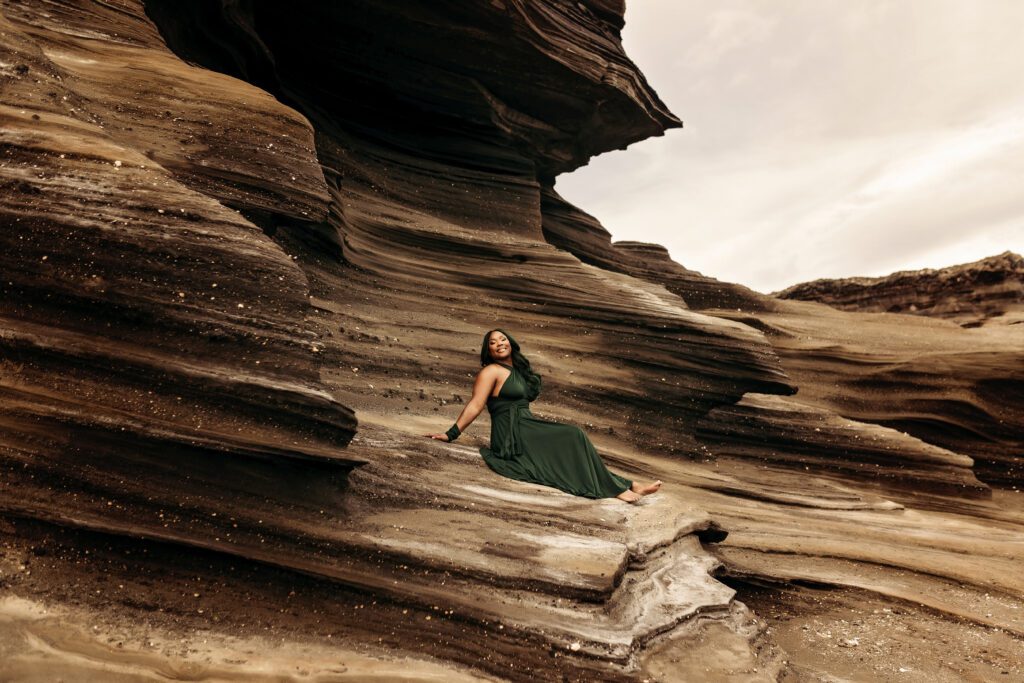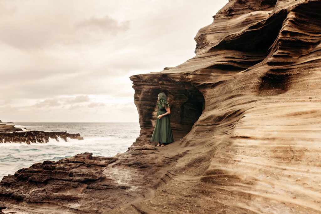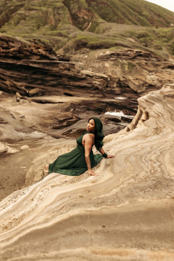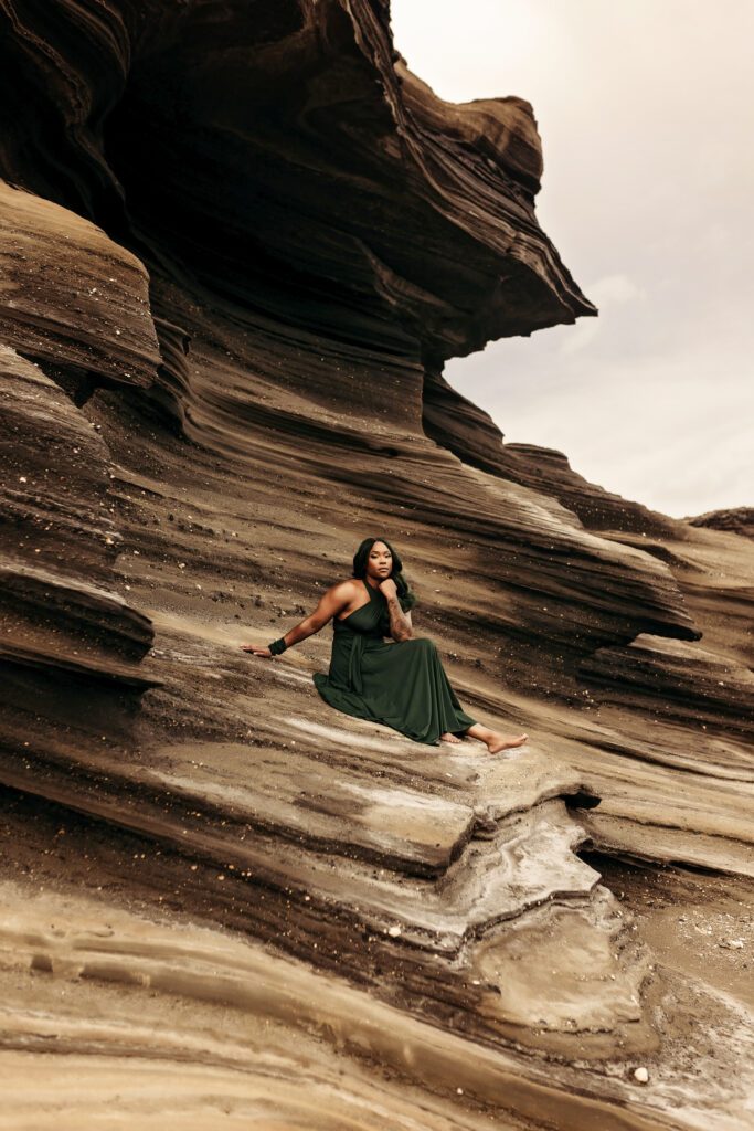 This Oahu solo photosession took place at Lanai Lookout on Oʻahu, Hawaii, a dramatic coastal location known for its textured rock formations and expansive ocean views. The setting created a calm yet powerful backdrop, allowing the focus to remain on confidence, presence, and natural expression.