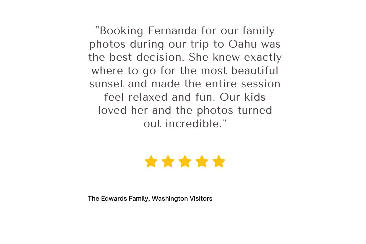 Fernanda Kenfield offers family, maternity, couples, elopements and boudoir photography services in Honolulu, Hawaii, on the Island of Oahu. Fernanda also attends the areas of Kailua, Kaneohe, Waimanalo, Hawaii Kai, Wahiawa, Haleiwa, Ewa Beach, Mililani, Kapolei, Barbers Point and is not limited to attend military bases such as Joint Base Pearl Harbor - Hickam, Ford island, Marines MCBH, Schofield Barracks. Waikiki Family Photographer, Honolulu Family Photographer, Kailua Family Photographer, Kaneohe Family Photographer, Kapolei Family Photographer, Waimanalo Family Photographer, Oahu Maternity Photographer, Honolulu Maternity Photographer.